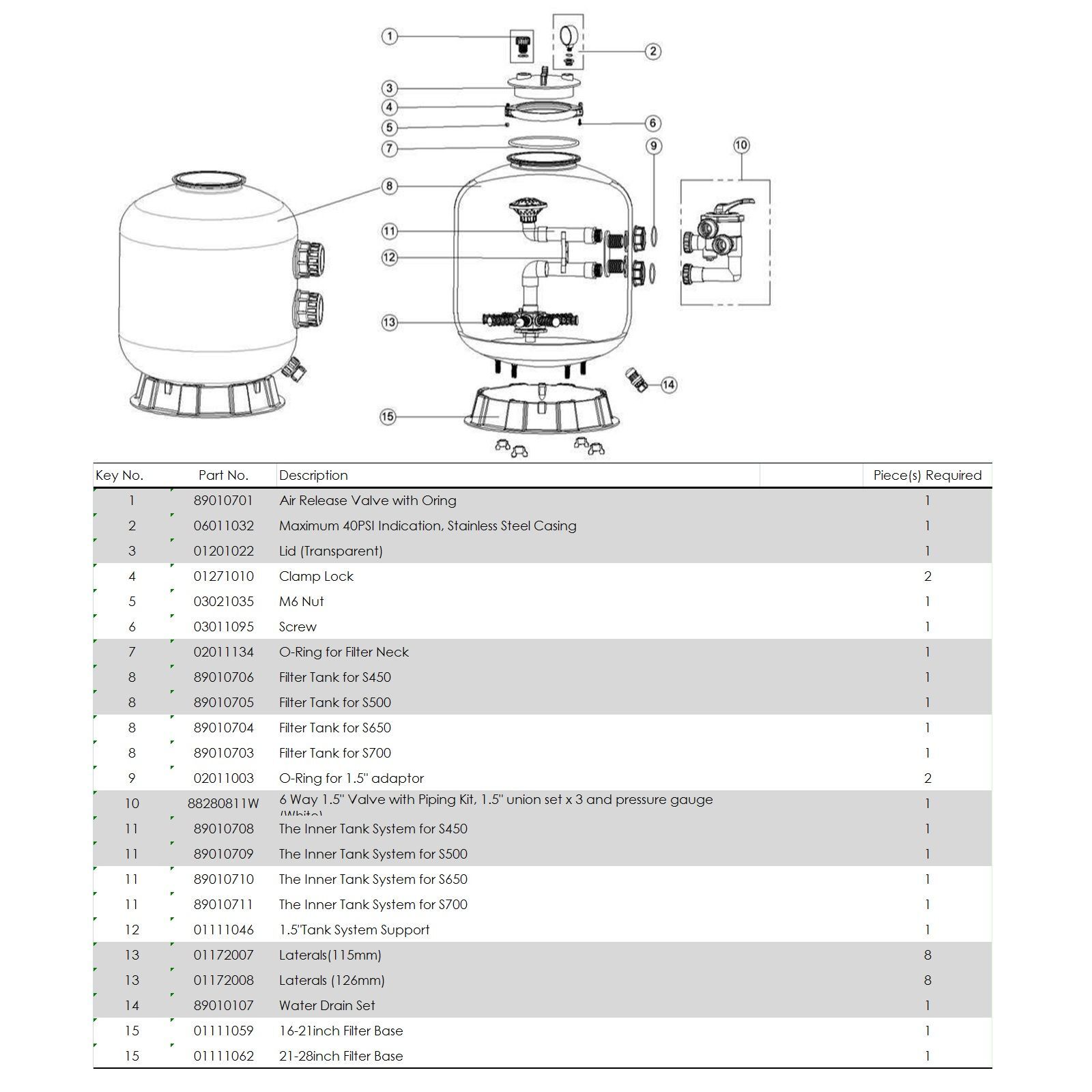 Модель S650 имеет потенциал фильтрации до 15,6 м³/час и является лучшим решением для бассейнов всех типов емкостью до 63 тыс.л. Механическая очистка воды производится за счет слоя песка, который загружается через верхнюю горловину бочки. В фильтре рекомендуется применять кварцевый или стеклянный песок, с фракцией 0.5 — 0.8 мм. Масса засыпки составляет до 145 кг. Фильтр оснащен 6-режимным клапаном управления фильтрацией Aquaviva. Тип подключения фильтра – боковой. Диаметр подключения стандартный – 1.5 дюйма (50 мм).